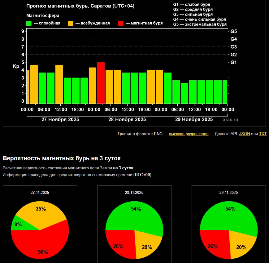 Как сообщает Лаборатория солнечной астрономии ИКИ и ИСЭФ, из-за нахождения нашей планеты в зоне действия корональной солнечной дыры на Земле уже третьи сутки происходят магнитосферные возмущения. Они продолжатся и завтра, 28 ноября, и перерастут в магнитную бурю около часа ночи. Продлится это негативное явление до 4 часов (время саратовское), а в норму магнитосфера нашей планеты вернется к 10 часам.