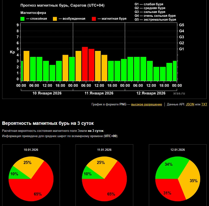 Как сообщает Лаборатория солнечной астрономии ИКИ и ИСЭФ, первый всплеск магнитосферных возмущений произойдет на нашей планете уже сегодня, 10 января, около 19 часов (время саратовское). После 1 часа 11 января за ним последует еще один, который к 4 часам перерастет в полноценную магнитную бурю. Она сразу же достигнет своего пика, а затем постепенно сила магнитной бури будет уменьшаться. И полностью магнитосфера Земли придет в норму только к 16 часам.
