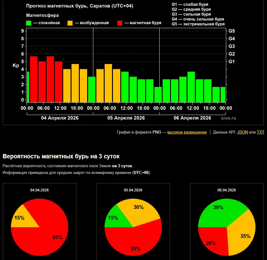 Как сообщает Лаборатория солнечной астрономии ИКИ и ИСЭФ, магнитная буря на нашей планете началась сегодня, 4 апреля, почти сразу после полуночи (время саратовское). С различной степенью интенсивности она будет бушевать на Земле примерно до 13 часов, после чего последует длительный период магнитосферных возмущений, и состояние нашей планеты придет в норму только к 22 часам. Впрочем, ученые не исключают, что магнитные бури повторятся и завтра (вероятность 55%).