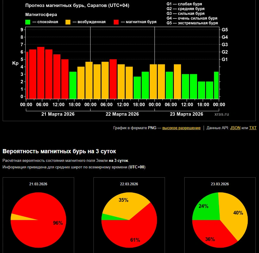 Как сообщает Лаборатория солнечной астрономии ИКИ и ИСЭФ, магнитная буря на нашей планете началась еще вчера, 20 марта, а на свой пик вышла сегодня примерно к 4 часам (время саратовское). Впрочем, на момент публикации этого материала пик шторма уже пройден, но магнитная буря не стихнет до 16 часов. Затем последует недолгое затишье, и геомагнитные возбуждения на Земле возобновятся к 19 часам. А завтра, по прогнозам ученых, к 7 часам перерастут в новую магнитную бурю.