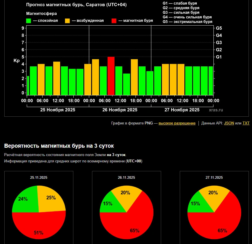 Как сообщает Лаборатория солнечной астрономии ИКИ и ИСЭФ, магнитосферные возмущения на нашей планете начались уже сегодня, 25 ноября. Первое из них прошло с 4 до 7 часов (время саратовское), а последнее завершится 27 ноября к 13 часам. Правда, силы магнитной бури, по предварительным прогнозам, они достигнут лишь однажды – 26 ноября в 7 часов. И продлится это неприятное явление примерно до 10 часов.