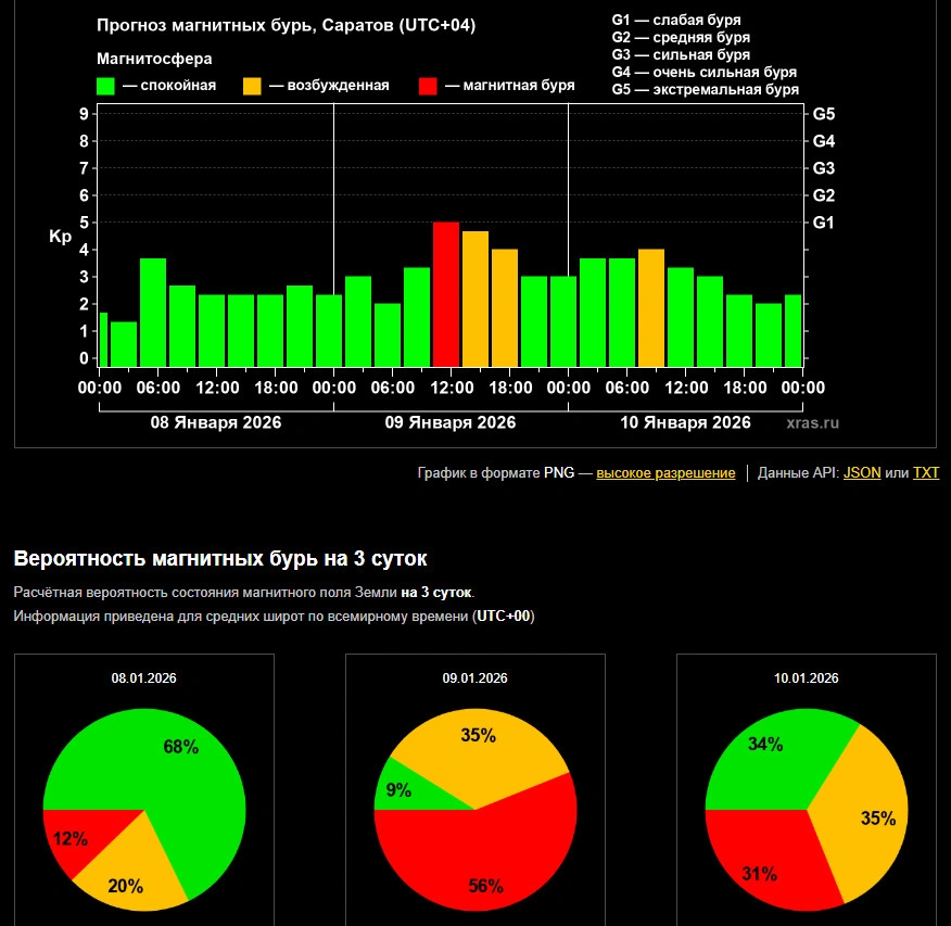 Как сообщает Лаборатория солнечной астрономии ИКИ и ИСЭФ, магнитная буря на нашей планете начнется завтра, 9 января, сразу, без магнитосферных возмущений. Она накроет Землю около 10 часов (время саратовское), и продлится примерно до 13 часов. Затем магнитосферные возмущения продолжатся еще около 6 часов, постепенно затихая, и состояние нашей планеты стабилизируется примерно к 19 часам.