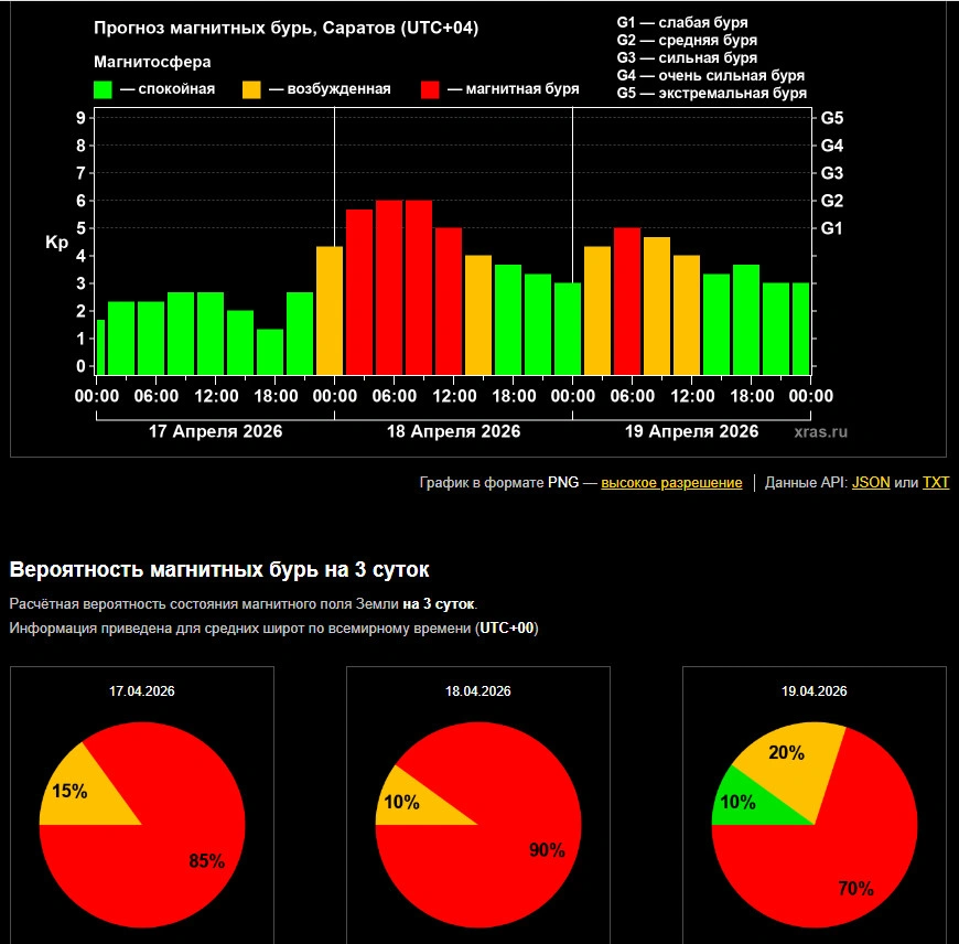 Как сообщает Лаборатория солнечной астрономии ИКИ и ИСЭФ, геомагнитные возмущения начнутся на нашей планете уже сегодня, 17 апреля, примерно в 22 часа (время саратовское). А магнитная буря начнется на Земле следом за ними, примерно в 1 час 18 апреля. На свой пик она выйдет около 4 часов, и продлится до 13 часов со снижением интенсивности в последнем отрезке. Правда, астрономы не исключают, что на этом все не закончится, и новая магнитная буря может пройти на Земле уже на следующий день, на Красную горку.