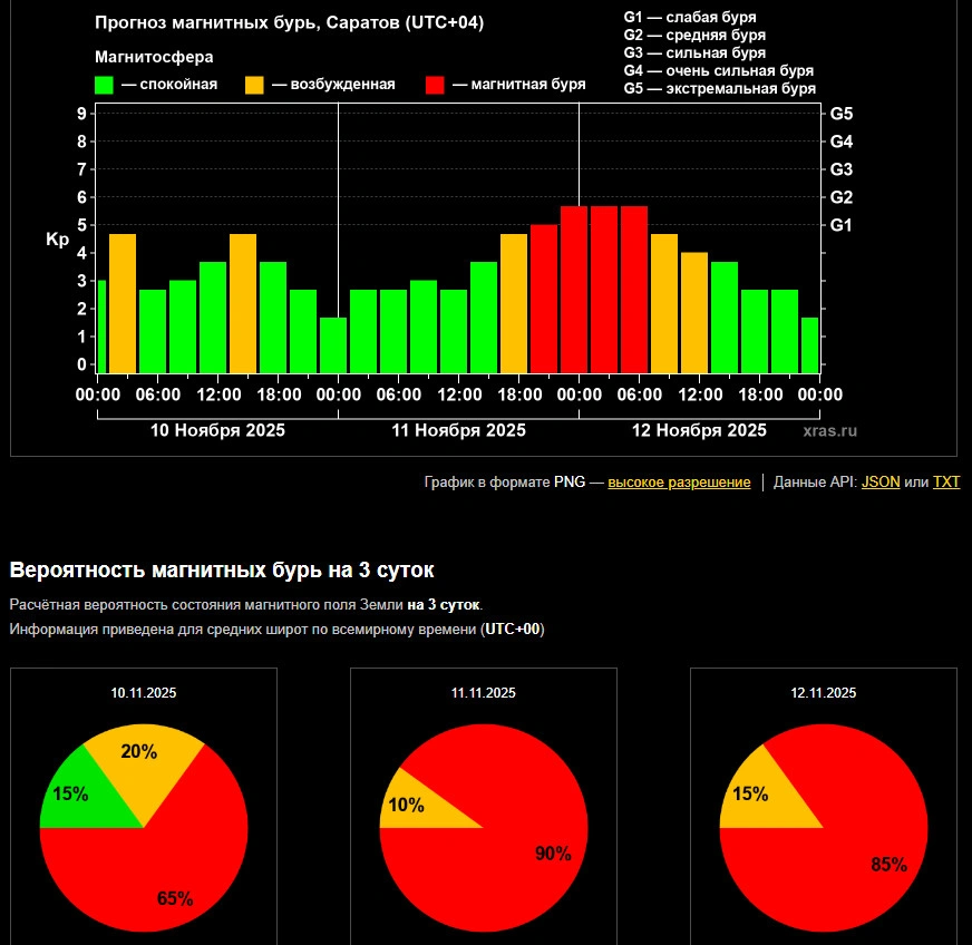 Как сообщает Лаборатория солнечной астрономии ИКИ и ИСЭФ, новые возмущения магнитосферы возникнут на нашей планете из-за мощной вспышки на Солнце уже завтра, 11 ноября. Они начнутся около 16 часов (время саратовское), а силу магнитной бури наберут примерно к 19 часам. Еще через три часа магнитосферный шторм выйдет на полную мощность, и на своем пике продержится до 7 часов 12 ноября. А в норму магнитосфера Земли придет только через 6 часов после этого – примерно к 13 часам.