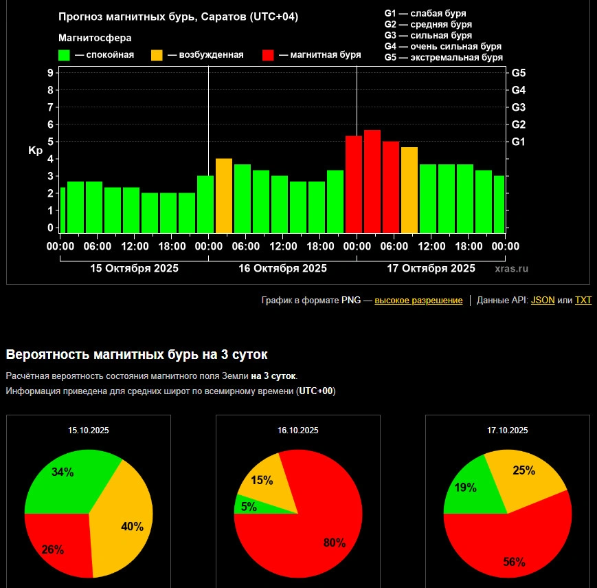 Как сообщает Лаборатория солнечной астрономии ИКИ и ИСЭФ, магнитная буря начнется на нашей планете завтра, 16 октября, около 22 часов (время саратовское). Первый удар шторма будет чуть выше минимальной силы, а затем магнитная буря начнет набирать обороты и выйдет на полную мощность примерно к часу ночи 17 октября. С 4 часов начнется постепенное снижение силы магнитосферных возмущений, а полностью состояние Земли придет в норму, по предварительным прогнозам, к 10 часам пятницы.