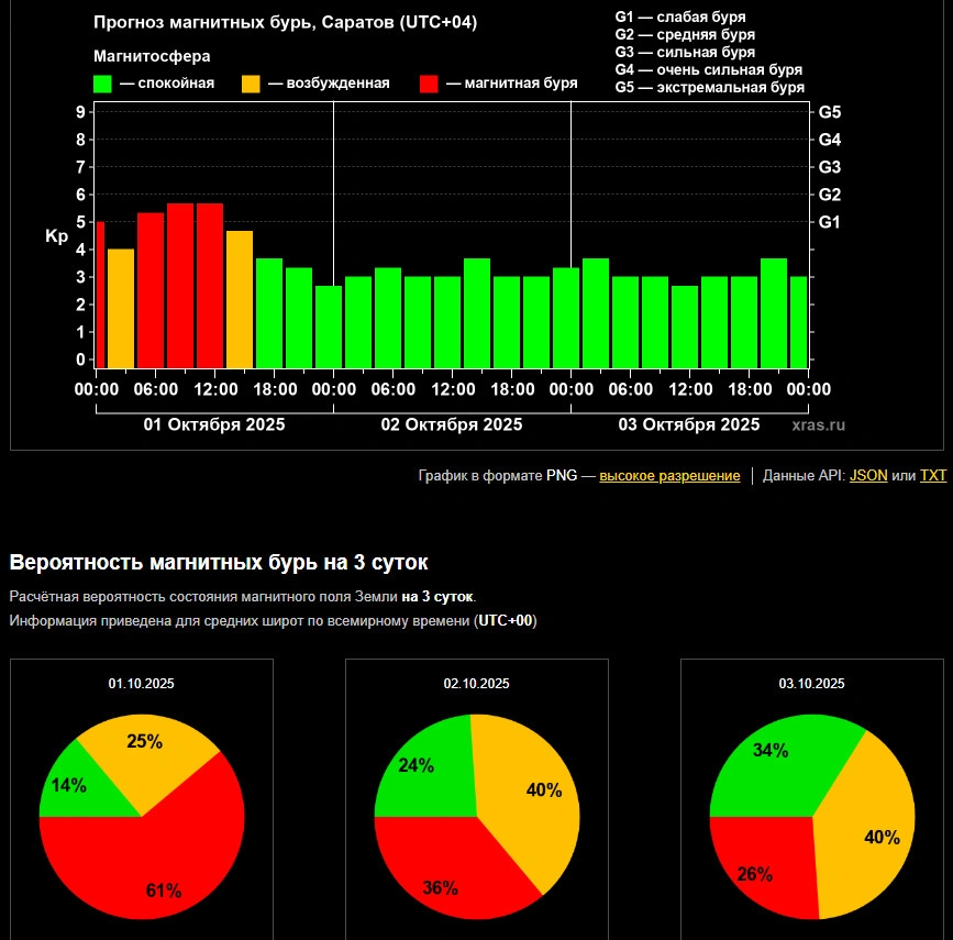 Как сообщает Лаборатория солнечной астрономии ИКИ и ИСЭФ, магнитная буря началась на нашей планете сегодня, 1 октября, примерно в 4 часа (время саратовское). На свой пик она вышла около 7 часов, и продержится на этом уровне примерно до 13 часов. Затем магнитосферные возмущения пойдут на спад, и состояние Земли придет в норму к 16 часам.