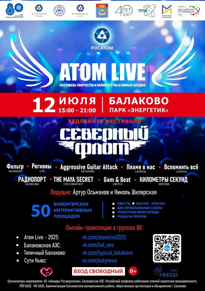 Фестиваль творчества и волонтерства атомных городов «Атом Live - 2025», посвященный 80-летию Великой Победы и 80-летию атомной промышленности, пройдёт в г. Балаково 12 июля 2025. На фестивале будут: