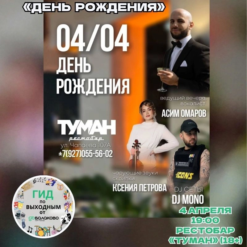 «Туман» отмечает свой первый День рождения. В этот вечер рестобар будет не только принимать поздравления, но и дарить посетителям подарки – живую музыку от скрипачки Ksenia Petrova, DJ-сеты Дениса Моно, фокусника с эффектным шоу и магией вблизи, а еще будет welcome-зона и яркий фотограф Наталья Малкина. И все это в обрамлении работы поющего ведущего Асима Омарова. Ну и, конечно же, будет традиционный праздничный торт. Это будет вечер музыки, эмоций и красивых моментов, которые захочется прожить снова, и, пожалуй, стоит прийти и разделить этот праздник вместе с друзьями и коллективом «Тумана»!
