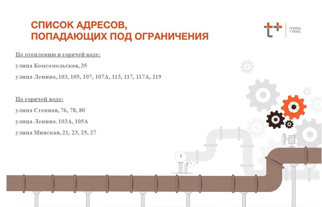 «Заменим почти 70 метров трубопроводов, а на время ремонтов приостановим отопление и горячее водоснабжение в некоторых домах. Приложим все усилия, чтобы включить тепло и воду до конца суток», - заявили в «Т плюс».