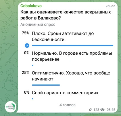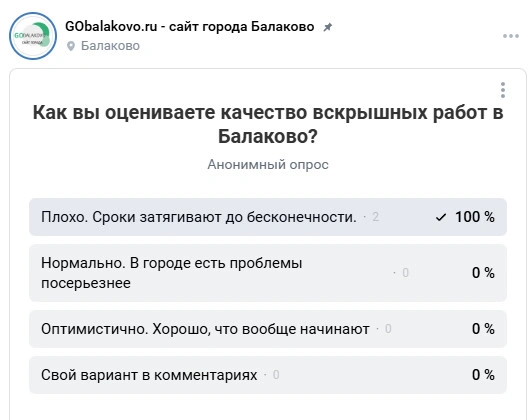 Свой традиционный социальны опрос мы запустили в конце прошлой недели на наших вспомогательных интернет-ресурсах. Редакция Gobalakovo попросила читателей оценить качество вскрышных работ в Балаково, и подавляющее большинство поставило неудовлетворительную оценку: «Плохо. Сроки затягивают до бесконечности» (100% - в ВК, и 75% - в ТГ).