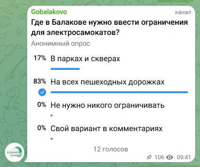 Свой традиционный анонимный социальный опрос мы запустили в конце прошлой недели на наших площадках в социальных сетях и мессенджерах. Подписчикам был задан вопрос о том, где в Балаково нужно ввести ограничения для электросамокатов, и большинство респондентов выбрало жесткие меры – «на всех пешеходных дорожках» (57,14% - в социальной сети «ВКонтакте» и 83% - на нашем телеграм-канале):