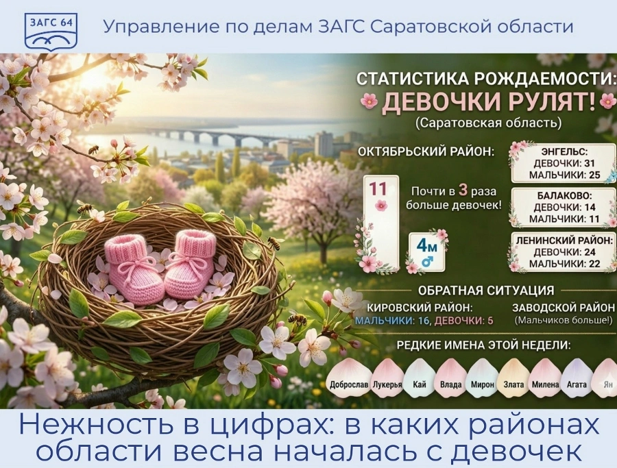 Региональное Управление ЗАГС сообщает, что весна в Саратовской области началась с преобладания представительниц прекрасного пола среди новорожденных. Пока по весне в регионе больше регистрируют девочек, а в список редких имен попали Доброслав и Лукерья.