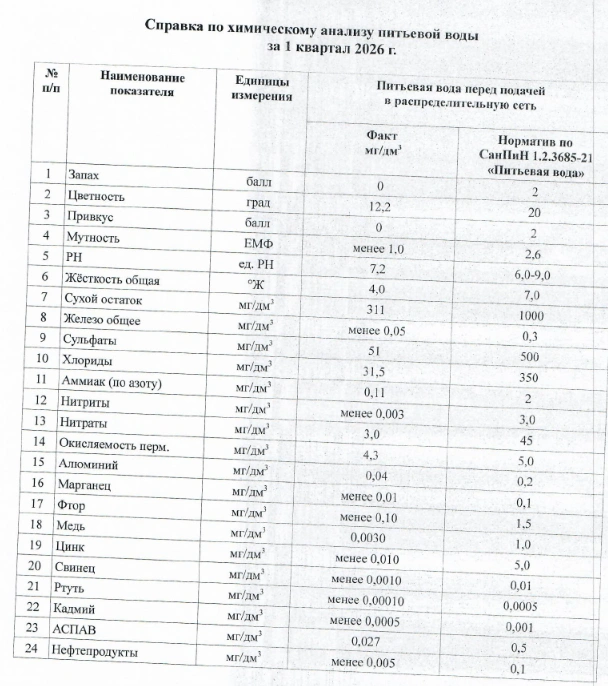 Как утверждает «Балаково-Водоканала», в целом, в 1 квартале 2026 года по химическому составу питьевая вода в Балаково находилась в пределах допустимых параметров. Наиболее близко к предельно допустимым показателям оказались перманганатная окисляемость – 4,4 при максимальном значении 5,0; кислотность – 7,2 (максимум – 6,0-9,0); цветность – 12,2 (максимум – 20). Остальные критерии были далеки от предельных значений. Подробности в справке.