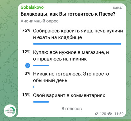 Свой традиционный анонимный социальный опрос мы запустили на своих интернет-ресурсах в конце прошлой неделе. Подписчикам был задан вопрос о том, как они собираются готовиться готовится к Пасхе, и на этот раз мнения респондентов на различных площадках разделились. В нашей группе социальной сети «ВКонтакте» большинство участников опроса сообщили, что закупят все необходимое для праздника в магазине, и отправятся на пикник (50%). А вот на нашем телеграм-канале наибольшее количество голосов набрал вариант «собираюсь красить яйца, печь куличи и ехать на кладбище» (75%):