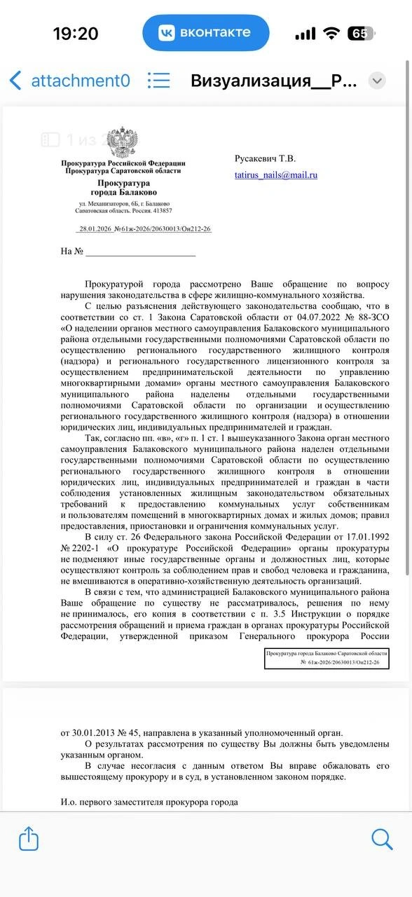 В частности, в декабре прошлого года районная администрация проинформировала жильцов злополучного дома, что была проведена регулировка внутридомовых систем отопления и ее «обезвоздушивание». Якобы, после этого ситуация улучшилась. Вот только жители с этим не согласились, и обратились с жалобой в прокуратуру, на что получили ответ: «администрацией Балаковского района Ваше обращение по существу не рассматривалось, решение по нему не принимало». А в итоге порекомендовали обращаться в суд.