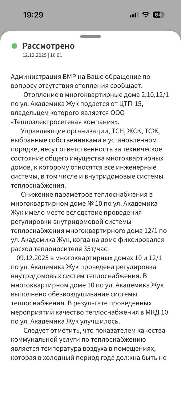 Светлана рассказала, что проблемы с отоплением в доме №10 на улице Академика Жука начались еще в декабре 2025 года, и за это время его жильцы обратились во все возможные инстанции – в управляющую компанию, в «Т Плюс», в администрацию и даже в прокуратуру. Ответы приходят разные, и все инстанции отчитываются о своей проделанной работе, но ситуация с отоплением в доме не улучшается.