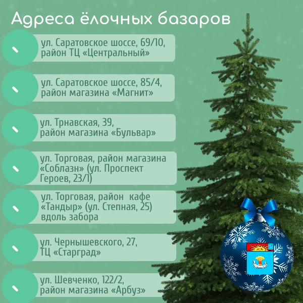 Как сообщает пресс-служба администрации Балаковского района, ёлочные базары начали официально работать с сегодняшнего дня, 15 декабря, и будут функционировать до 31 декабря. И всего в Балаково будет свыше 20 базаров, на которых балаковцы смогут приобрести ёлочку. Адреса в карточках.