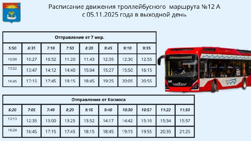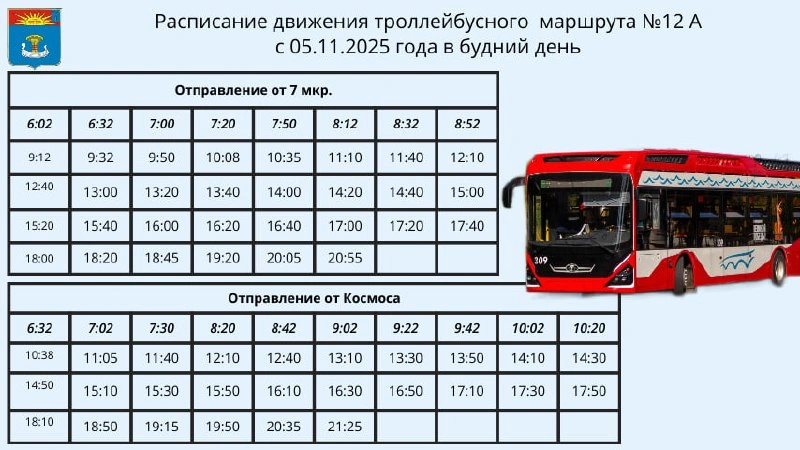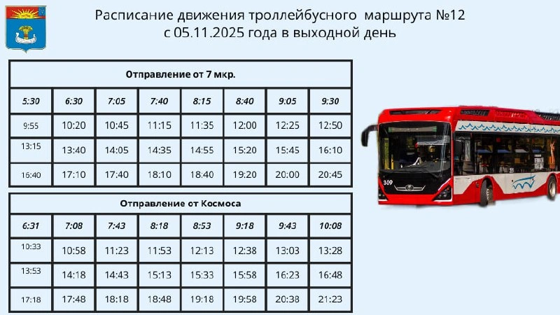 Как сообщает пресс-служба администрации Балаковского района, с 5 ноября троллейбусы №12 и №12А начнут ходить по новому расписанию. Кроме того, со 2 ноября работа троллейбусного маршрута №17 прекращается в связи с окончанием навигационного сезона. Власти просят балаковцев учитывать данную информацию при планировании поездок. Подробности в карточках.