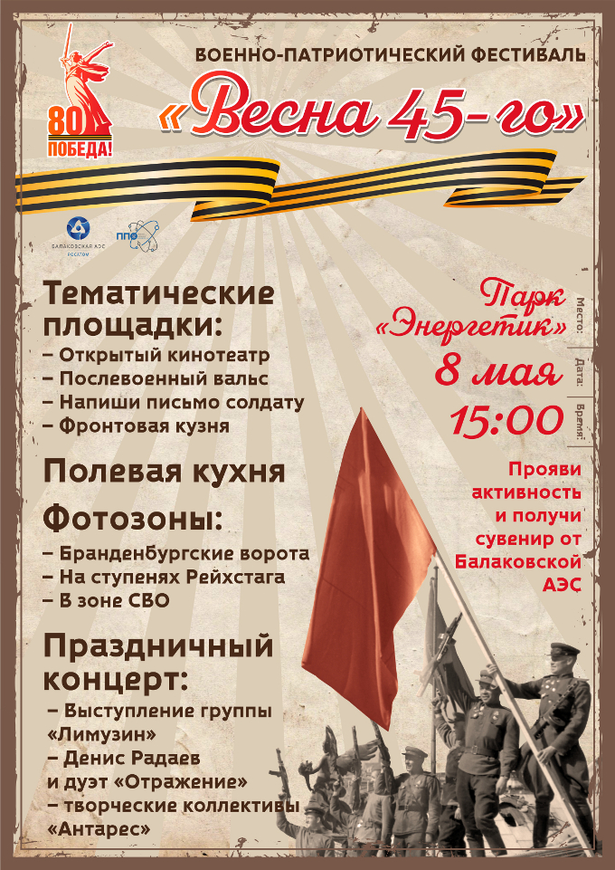Балаковская АЭС решила внести свой вклад в празднование 80-летия Великой Победы в Балаково. Под эгидой атомщиков в городе пройдет военно-патриотический фестиваль «Весна 45-го», и балаковцев приглашают принять в нем участие.