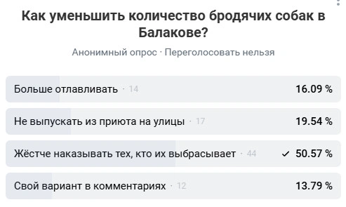 Свой традиционный опрос мы проводили на двух площадках – в нашей группе в ВК и на нашем телеграм-канале. Подписчикам был задан один вопрос: «Как уменьшить количество бродячих собак в Балаково?», и большинство респондентов (50,57% - в ВК, и 56% - в ТГ) считают, что нужно жёстче наказывать тех, кто выбрасывает на улицу животных.