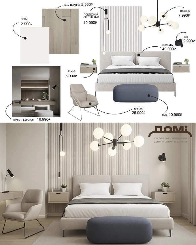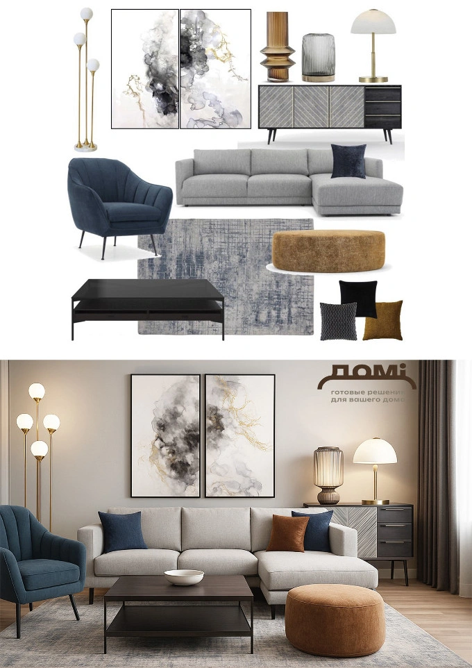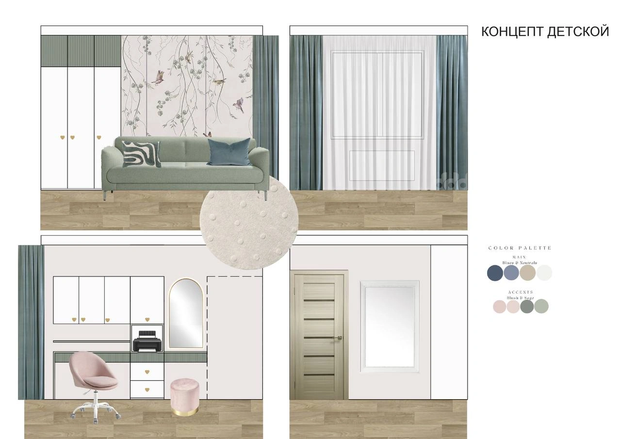 - Получить готовую концепцию интерьера с расстановкой мебели, цветовой палитрой и подбором материалов.