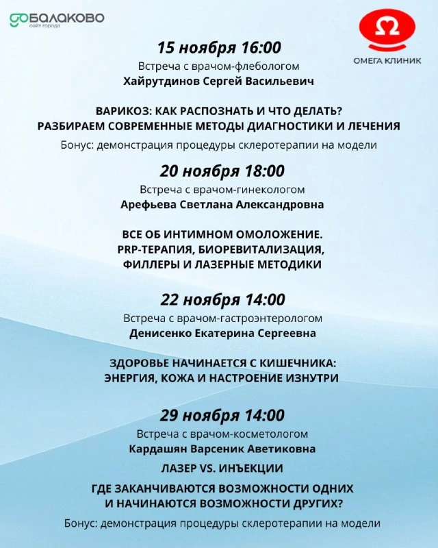 На этом осенний марафон здоровья в «Омега Клиник» не заканчивается! Впереди запланировано еще немало разных встреч на самые интересные и волнующие темы, на которых будет еще больше лайфхаков, энергии и вдохновения. Публикуем для наших читателей расписание этих креативных мероприятий: