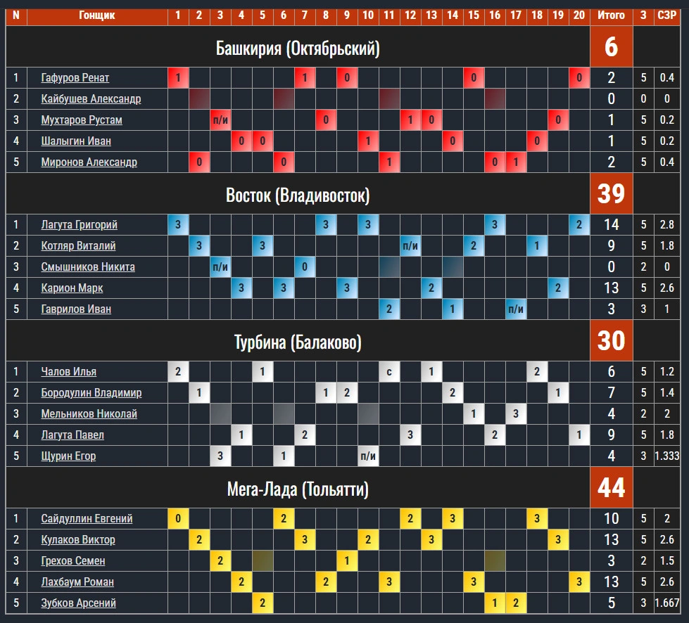 Финал командного Кубка России по спидвею прошел во Владивостоке вчера, 2 октября. Балаковскую «Турбину» на этих соревнованиях представляли 5 гонщиков. Причем одного юниора – Егора Щурина – по ходу гонки заменил другой юниор – Николай Мельников. И если, статистически, объединить набранные ими очки, как итог выступления одного гонщика, то получится второй результат в команде: Павел Лагута — 9 очков, Владимир Бородулин — 7 очков, Илья Чалов — 6 очков, Егор Щурин и Николай Мельников — по 4 очка. Но «Трубине» их усердия оказалось недостаточно, и команда завоевала только «бронзу»: