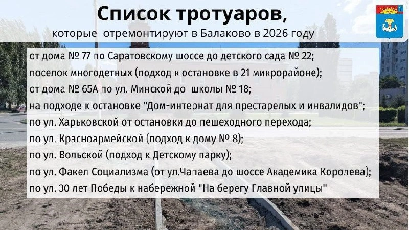 Об этом глава Балаковского района сообщил на своих интернет-ресурсах. Сергей Барулин утверждает, что в 2026 году в городе Балаково продолжится ремонт тротуаров. Средства выделены из областного бюджета по инициативе губернатора Саратовской области Романа Бусаргина. Всего планируется отремонтировать 9 участков тротуаров. Адреса – в карточке.