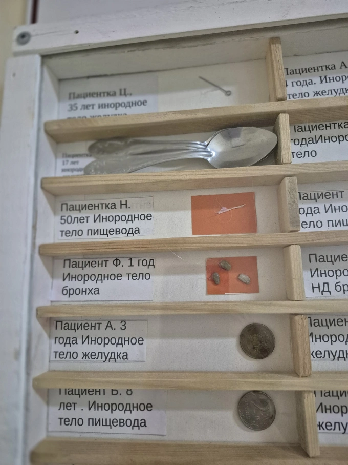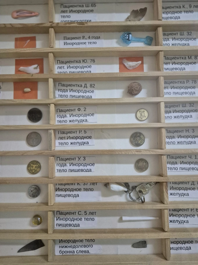 В ней оказались самые разные предметы. И если у детей случаи проглатывания различных предметов довольно часты и объяснимы, то со взрослыми все сложнее. В коллекции медиков немало «детски» трофеев: заколка, «скрепыш», «ушко» от жестяной бутылки, монеты. А вот из взрослых врачи извлекают более опасные находки: ложки, лезвия ножей, ключи (один из них с брелоком), колпачок от ручки, булавку и другое.